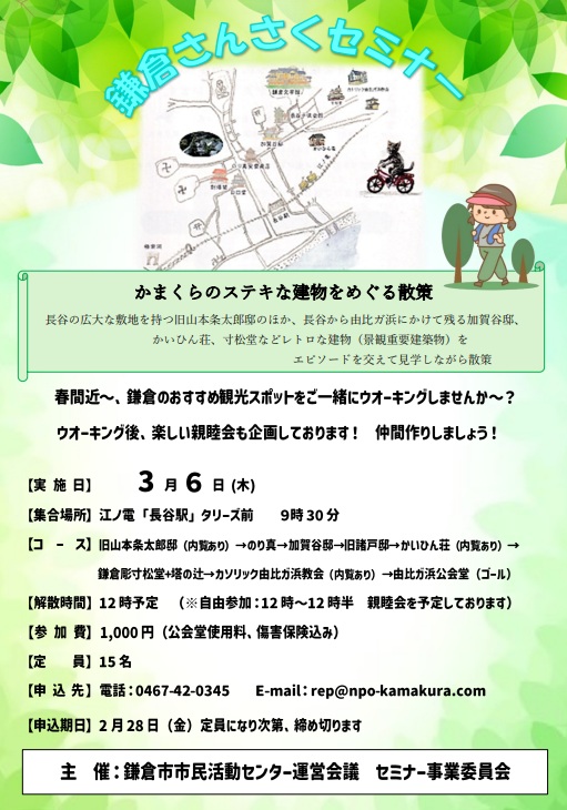 コソガイとは? 鎌倉散策セミナー 鎌倉の素敵な建物を巡りながら、街の歴史に触れる HP (2025年03月) 鎌倉市市民活動センター運営会議が主催するセミナーで、講師として地域の歴史的エピソードを解説。