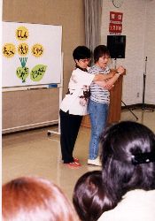 | ↑ 知らない人に捕まえられそうになった時の逃げ方を体験学習する小学校1年生。 | ↑ 子ども向けのロールプレイの再現シーンを身を乗り出して見る大人。 |