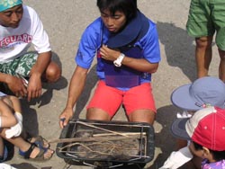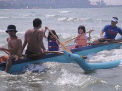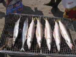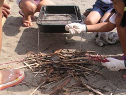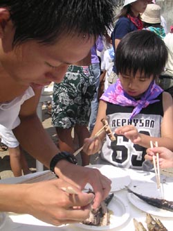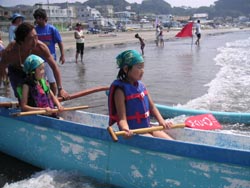 ■9月になり、海の家こそ取り壊されたけど、夏はそのまま材木座海岸に居座っています。今日は、鎌倉キッズプログラム最終回。「キッズプログラムと言えばカヌー!」の声にお応えして、今期2回目のカヌー体験&お楽しみのバーベキュー大会です。 ■アウトリガーカヌーも2回目となると、子ども達の表情にも余裕が。今回は搭乗前に、「沖から何が見えるかな?チェックしてこよう」という宿題が出されました。だけどみんな漕ぐのに夢中で、沖に出たらワクワクしちゃって、宿題がちゃんとできた子は少なかったみたい・・。まあいいか。カヌーの待ち時間には、特別に用意してもらったボディーボードにも挑戦! 初めてなのにスイ〜ッと波に乗れる子が続出して、スタッフもびっくり! ■今日のもう一つの宿題は、「班ごとにマッチ10本と半分の新聞紙で火をおこしてみよう!」です。せっかく浜でバーベキュをやるんだもの、火ぐらい自分たちでおこさなくちゃ。でもマッチにさわるのも初めて、というような子どもたち。ほんとに大丈夫? ■そこはKOCのお兄さん、お姉さんたちが頼りになります。海岸に落ちている流木を使って、上手に火をおこす方法を教えてくれました。わずか1本のマッチの火を大切に大切に育て、やがてコンロ中を覆う立派な炎になる様子を目の当たりにした子どもたち。自分でおこした火で焼く魚は、さぞおいしいだろうなあ。 ■届けられた食材は、しらす(KKP恒例のしらす丼!)、かます、たかべ、いか、さんま、たこなど、いずれも湘南の海の幸です。普段は魚にあまり食指が伸びない子どもたちも、今日はダイナミックにかぶりついていました。鎌倉ワカメを入れたみそ汁、ゆでだこなども大好評。大勢でワイワイ食べる御飯はほんとおいしい! ■たらふく食べたあとは、表彰式です。キッズプログラムを通じて、大いに遊び、学んだ証として、一人一人名前と写真入りの「修了証」を手渡してもらいました。たった4回だったけど、鎌倉の海というステージで、かけがえのない宝物を手にした子どもたち。この体験は、みんなきっと忘れないよね。そして自然を愛し、鎌倉という環境を愛する大人に成長してくれますようにと、スタッフ一同願っています。 感想は→こちら |