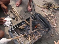 ↑ 火おこし班はコンロ前に集合。 | ↑ みんなで集めた流木を使うよ。 |