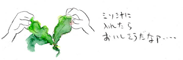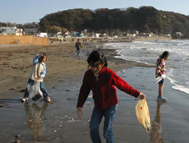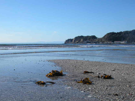 ↑ まずは海藻をひろいに海へ | ↑ 波打ち際にただよう海藻をゲット! |