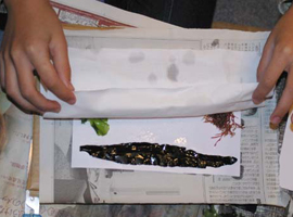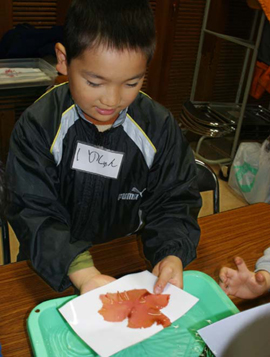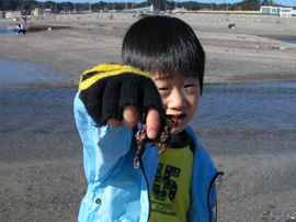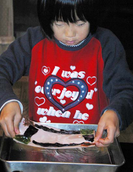 ■押し花や押し葉を作ったことがある子は多いけど、海藻でも「おしば」ができるの知ってる? 生きた海藻を紙に広げて、押しつぶして「おしば」を作るなんて、海が身近にある鎌倉ならではの楽しみかも。 ■まずは材木座海岸へでかけます。目につくのは砂浜にうち上げられた大きな海藻。でも「おしば」にするなら、波打ち際に漂っているような小さな海藻の方が向いています。色や形、いろいろな種類を集めましょう。拾った海藻は、海水を入れたバケツやビニール袋にいれて、屋内へと移動。 ■海藻は水道水で砂やゴミを洗い落とし、さらに5〜10分水にさらして塩をぬきます。赤い、繊維の細かい海藻はササっと洗うだけでOK。そして水をはった深めのバットやプラスチックケースに浮かべておきます。 ![]() ![]() ■この続きは家に帰ってからの宿題です。「おしば」を貼った紙を、水吸い取り用の布、新聞紙、ダンボールなどで挟み込んでサンドイッチにします。サンドイッチの上に電話帳をのせ、あれば漬物石のような重しをのせて、2〜3日乾燥させます。その間は、朝夕新聞紙をとりかえるか、扇風機で風をあてておけば万全です。 ■完成した「おしば」作品は本当に個性的なものばかり。絵や文字を書き足して遊んだり、パウチッコをすれば世界にたった一つのしおりや下敷きとして使えますね。 |