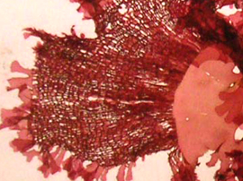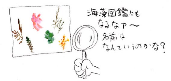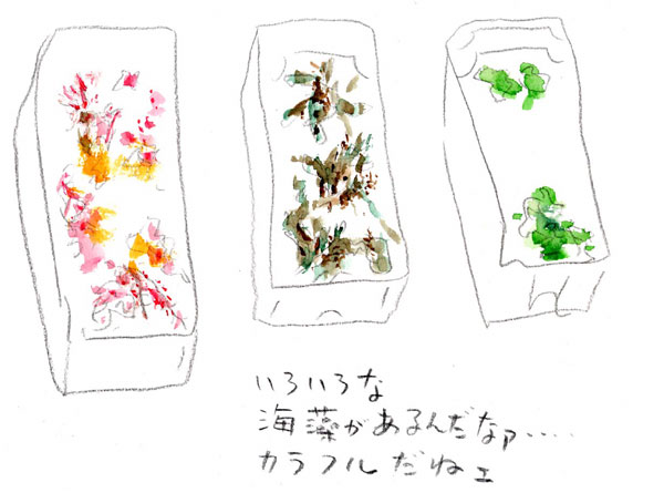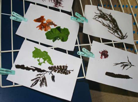 ↓ いろんな種類の海藻をならべて・・ | ↑ 水に浮かべた海藻をそっと紙ですくい上げます。 |