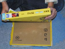 ↑ 新聞紙と布ではさんで・・ | ↑ ダンボールと電話帳で押さえます |
